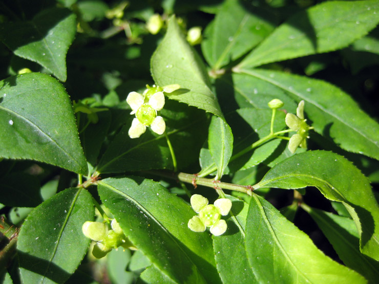 Цветение: | цветы у Euonimusа крылатого зелено-желтые, собраны по 3 в зонтичные соцветия, очень обильно цветущее, но малозаметное, цветет в маеиюне. |